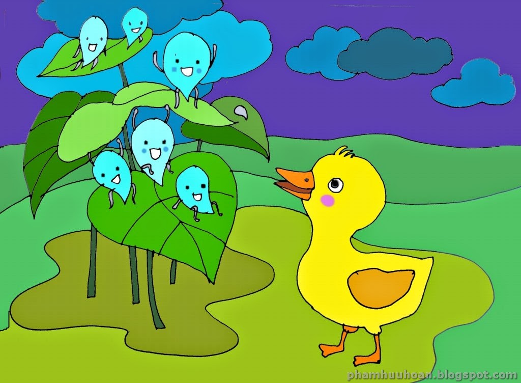 - Ôi, hay quá! – Vịt con reo lên – Vậy thì từ nay, Vịt con sẽ không gọi các bạn là những hạt nước bé xíu nữa đâu mà sẽ gọi các bạn là những “nàng tiên mưa” nhé! Các bạn có thích không?