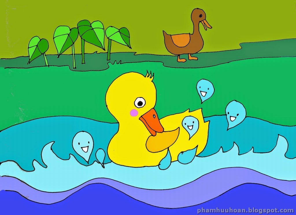 Hôm nay, Vịt con được mẹ cho ra sông tắm mát. Vịt con thích lắm. Vịt con đằm mình trong dòng nước. Những giọt nước bé tí xíu tinh nghịch rủ nhau trèo lên lưng, lên đầu Vịt con rồi lại lăn xuống mặt nước.