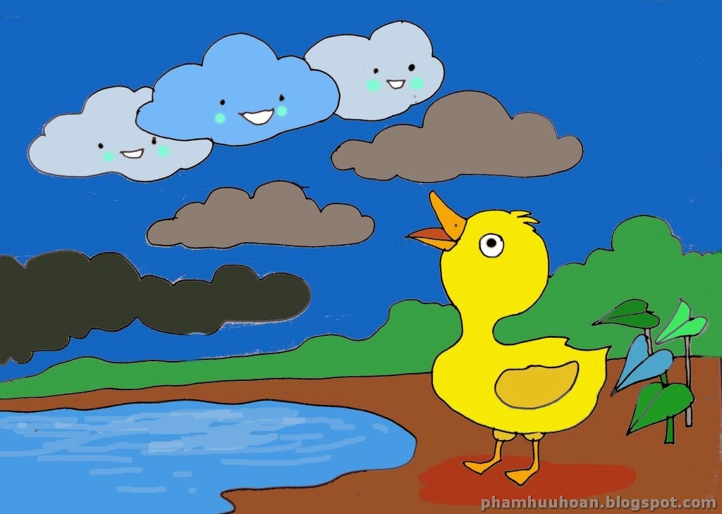 - Vịt con biết không? Hơi nước bốc lên trời tạo thành những đám mây đen. Khi gặp không khí lạnh, những đám mây tụ lại thành mưa rơi xuống mặt đất và chúng tôi lại trở thành những hạt nước bé xíu đấy! – Những hạt nước thi nhau kể với Vịt con.