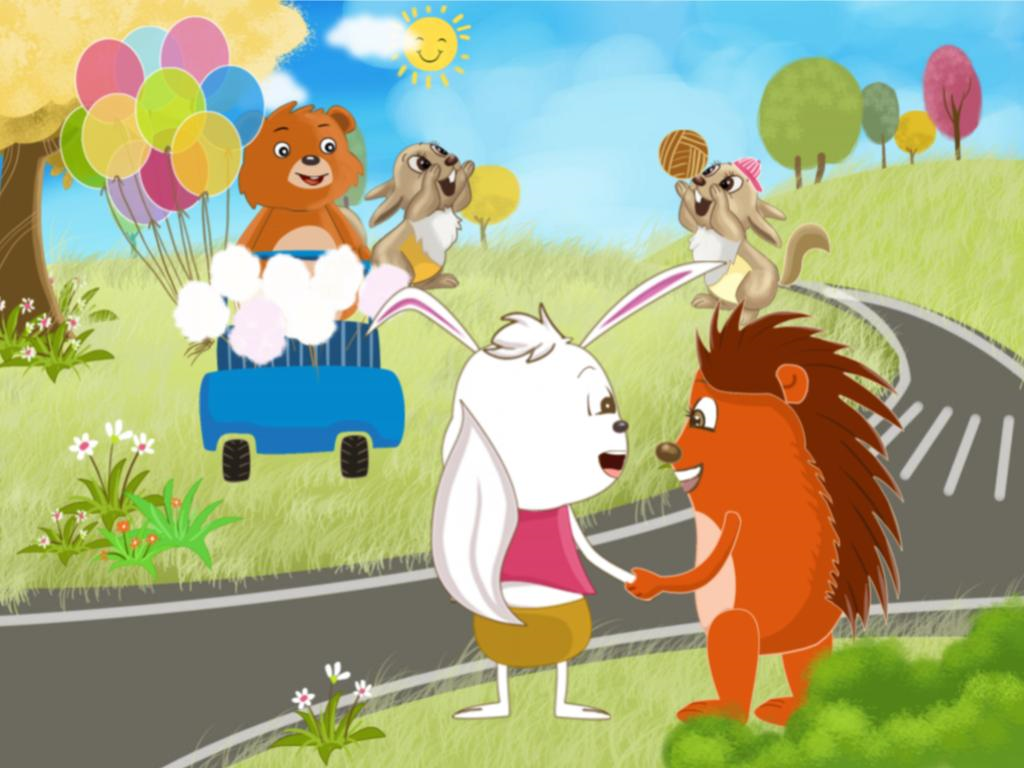 Nhím động viên Thỏ: “Từ nay chúng mình cùng phải cẩn thận hơn khi sang đường, phải nhìn sang trái, sang phải, không có xe đến gần mới được qua đường”. Thỏ bẽn lẽn: “Tớ đồng ý”.