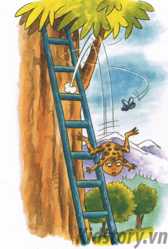 Cóc bắt đầu thận trọng trèo lên thang và nó leo một cách vô cùng từ tốn, chậm chạp vì nó biết rằng phải giữ sức thì mới leo đến tận cùng được. với sự cẩn thận ấy, cóc đã mất gần bảy năm trời để leo lên chiếc thang và khi nó đang rất gần mục tiêu thì bỗng có một con ruồi từ đâu bay tới cứ vo ve xung quanh như muốn trêu ngươi nó. Cóc cảm thấy vô cùng khó chịu, nó nhìn thẳng vào con ruồi và định bụng nhảy lên nuốt chửng con ruồi ấy. nhưng nó đã vồ trượt con ruồi và bị ngã nhào xuống đất.