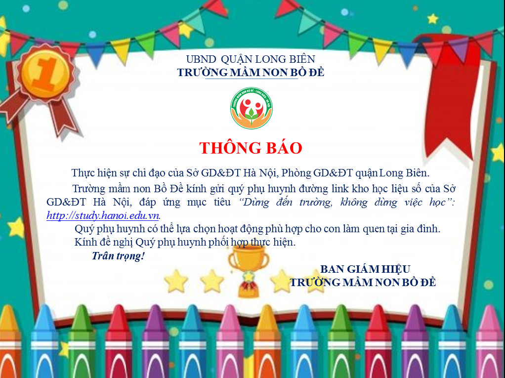 Trường mầm non Bồ Đề kính gửi Quý phụ huynh đường link: http://study.hanoi.edu.vn kho học liệu số của Sở GD&ĐT Hà Nội, nhằm đáp ứng mục tiêu "Dừng đến trường, không dừng việc học". Quý phụ huynh có thể truy cập và đường link và lựa chọn một số hoạt động chăm sóc nuôi dưỡng giáo dục trẻ để dạy con khi nghỉ dịch ở nhà nhé!