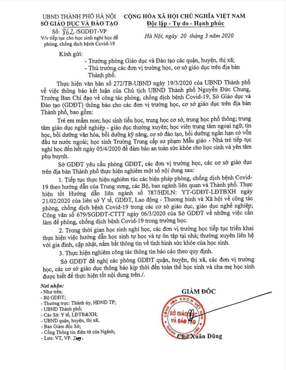 Thực hiện Công văn Số 862/SGDĐT-VP, ngày 20/3/2020 của Sở Giáo dục và Đào tạo Hà Nội V/v tiếp tục cho học sinh nghỉ học để phòng, chống dịch bệnh Covid-19.