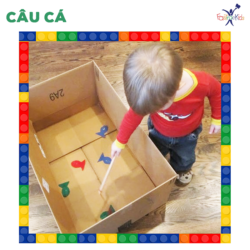 Cách tiến hành: phụ huynh dùng kéo cắt giấy màu thành hình những chú cá dễ thương và thả vào thùng. Sau đó, bạn cho con một chiếc đũa hoặc 1 que dài bất kì để con câu cá. Trò chơi này giúp cải thiện khả năng phối hợp tay mắt của trẻ ở độ tuổi 2-3.