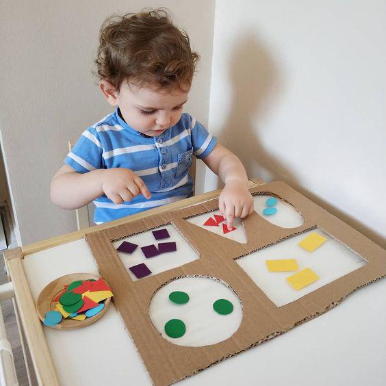 * Hướng dẫn bé chơi: Nhiệm vụ của bé là lựa chọn các hình giấy màu có hình khối tương thích, đặt vào đúng hình khối tại miếng bìa các tông to. Hoạt động này giống như việc phân loại hình khối cùng loại về chung với nhau (như nhặt những hạt đậu).